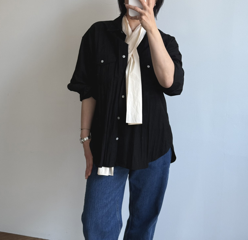 셔츠깃을 여민듯 한 이미지의 스카프 입니다